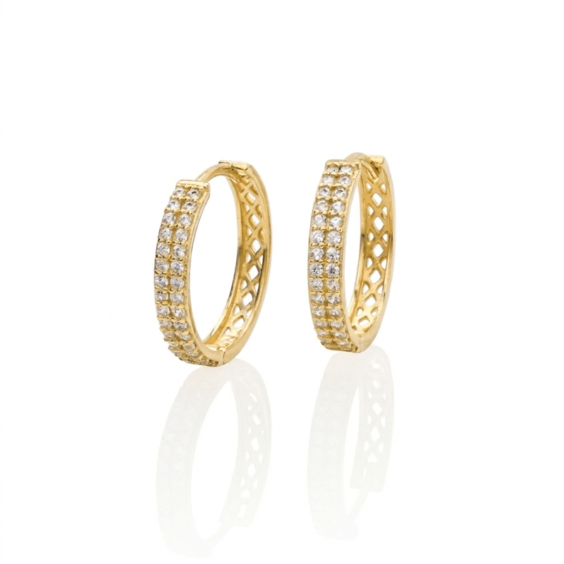 Material: Ouro Amarelo 18k/750 Diâmetro: 14,90mm Espessura do Aro: 1,30mm Fecho: Click Composição: De ouro 750, polido, vazado no verso, com 30 pedras de zircônias brancas em cada (60 total no par).