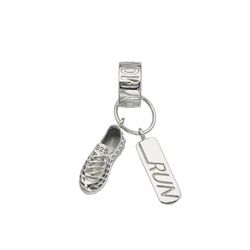 Composição: De prata 925 polido e com ródio, contra argola berloque escrito MOVE YOUR BODY, pendurado um tenis esportivo e um plaquinha escrito _RUN.