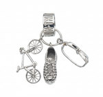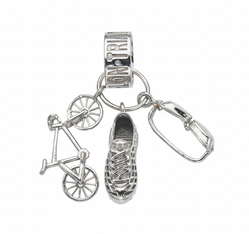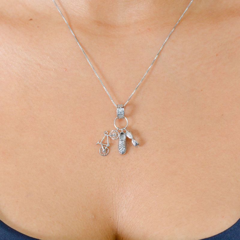 Composição: De prata 925 polido com ródio, contra argola berloque escrito TRIATHLON, pendurado um tênis de corrida, uma bicicleta de ciclismo e um óculos de natação.